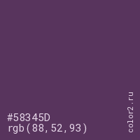 Цвет #58345D в цветовой модели RGB обозначается тремя октетами (88, 52, 93) в десятичном формате и #58345D в шестнадцатиричном (hex) формате, которые являются интенсивностью красного 88 (hex 58), интенсивность зелёного 52 (hex 34) и интенсивность синего 93 (hex 5D).