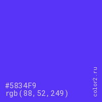 Цвет #5834F9 в цветовой модели RGB обозначается тремя октетами (88, 52, 249) в десятичном формате и #5834F9 в шестнадцатиричном (hex) формате, которые являются интенсивностью красного 88 (hex 58), интенсивность зелёного 52 (hex 34) и интенсивность синего 249 (hex F9).