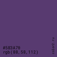 Цвет #583A70 в цветовой модели RGB обозначается тремя октетами (88, 58, 112) в десятичном формате и #583A70 в шестнадцатиричном (hex) формате, которые являются интенсивностью красного 88 (hex 58), интенсивность зелёного 58 (hex 3A) и интенсивность синего 112 (hex 70).