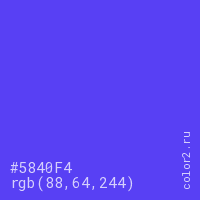 Цвет #5840F4 в цветовой модели RGB обозначается тремя октетами (88, 64, 244) в десятичном формате и #5840F4 в шестнадцатиричном (hex) формате, которые являются интенсивностью красного 88 (hex 58), интенсивность зелёного 64 (hex 40) и интенсивность синего 244 (hex F4).