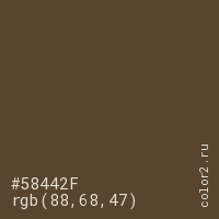 Цвет #58442F в цветовой модели RGB обозначается тремя октетами (88, 68, 47) в десятичном формате и #58442F в шестнадцатиричном (hex) формате, которые являются интенсивностью красного 88 (hex 58), интенсивность зелёного 68 (hex 44) и интенсивность синего 47 (hex 2F).