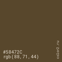 Цвет #58472C в цветовой модели RGB обозначается тремя октетами (88, 71, 44) в десятичном формате и #58472C в шестнадцатиричном (hex) формате, которые являются интенсивностью красного 88 (hex 58), интенсивность зелёного 71 (hex 47) и интенсивность синего 44 (hex 2C).
