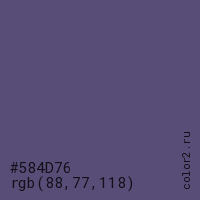 Цвет #584D76 в цветовой модели RGB обозначается тремя октетами (88, 77, 118) в десятичном формате и #584D76 в шестнадцатиричном (hex) формате, которые являются интенсивностью красного 88 (hex 58), интенсивность зелёного 77 (hex 4D) и интенсивность синего 118 (hex 76).