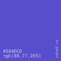Цвет #584DCD в цветовой модели RGB обозначается тремя октетами (88, 77, 205) в десятичном формате и #584DCD в шестнадцатиричном (hex) формате, которые являются интенсивностью красного 88 (hex 58), интенсивность зелёного 77 (hex 4D) и интенсивность синего 205 (hex CD).