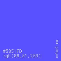 Цвет #5851FD в цветовой модели RGB обозначается тремя октетами (88, 81, 253) в десятичном формате и #5851FD в шестнадцатиричном (hex) формате, которые являются интенсивностью красного 88 (hex 58), интенсивность зелёного 81 (hex 51) и интенсивность синего 253 (hex FD).