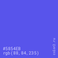 Цвет #5854EB в цветовой модели RGB обозначается тремя октетами (88, 84, 235) в десятичном формате и #5854EB в шестнадцатиричном (hex) формате, которые являются интенсивностью красного 88 (hex 58), интенсивность зелёного 84 (hex 54) и интенсивность синего 235 (hex EB).