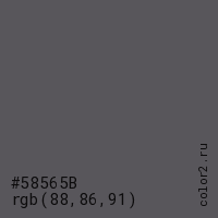 Цвет #58565B в цветовой модели RGB обозначается тремя октетами (88, 86, 91) в десятичном формате и #58565B в шестнадцатиричном (hex) формате, которые являются интенсивностью красного 88 (hex 58), интенсивность зелёного 86 (hex 56) и интенсивность синего 91 (hex 5B).