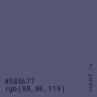 Цвет #585677 в цветовой модели RGB обозначается тремя октетами (88, 86, 119) в десятичном формате и #585677 в шестнадцатиричном (hex) формате, которые являются интенсивностью красного 88 (hex 58), интенсивность зелёного 86 (hex 56) и интенсивность синего 119 (hex 77).