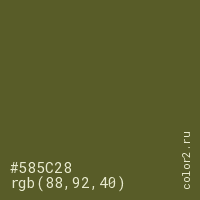 Цвет #585C28 в цветовой модели RGB обозначается тремя октетами (88, 92, 40) в десятичном формате и #585C28 в шестнадцатиричном (hex) формате, которые являются интенсивностью красного 88 (hex 58), интенсивность зелёного 92 (hex 5C) и интенсивность синего 40 (hex 28).