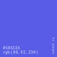 Цвет #585CE6 в цветовой модели RGB обозначается тремя октетами (88, 92, 230) в десятичном формате и #585CE6 в шестнадцатиричном (hex) формате, которые являются интенсивностью красного 88 (hex 58), интенсивность зелёного 92 (hex 5C) и интенсивность синего 230 (hex E6).