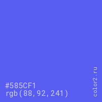 Цвет #585CF1 в цветовой модели RGB обозначается тремя октетами (88, 92, 241) в десятичном формате и #585CF1 в шестнадцатиричном (hex) формате, которые являются интенсивностью красного 88 (hex 58), интенсивность зелёного 92 (hex 5C) и интенсивность синего 241 (hex F1).