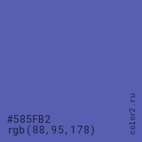 Цвет #585FB2 в цветовой модели RGB обозначается тремя октетами (88, 95, 178) в десятичном формате и #585FB2 в шестнадцатиричном (hex) формате, которые являются интенсивностью красного 88 (hex 58), интенсивность зелёного 95 (hex 5F) и интенсивность синего 178 (hex B2).