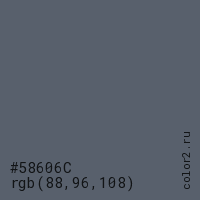 Цвет #58606C в цветовой модели RGB обозначается тремя октетами (88, 96, 108) в десятичном формате и #58606C в шестнадцатиричном (hex) формате, которые являются интенсивностью красного 88 (hex 58), интенсивность зелёного 96 (hex 60) и интенсивность синего 108 (hex 6C).