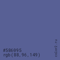 Цвет #586095 в цветовой модели RGB обозначается тремя октетами (88, 96, 149) в десятичном формате и #586095 в шестнадцатиричном (hex) формате, которые являются интенсивностью красного 88 (hex 58), интенсивность зелёного 96 (hex 60) и интенсивность синего 149 (hex 95).