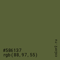 Цвет #586137 в цветовой модели RGB обозначается тремя октетами (88, 97, 55) в десятичном формате и #586137 в шестнадцатиричном (hex) формате, которые являются интенсивностью красного 88 (hex 58), интенсивность зелёного 97 (hex 61) и интенсивность синего 55 (hex 37).