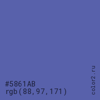Цвет #5861AB в цветовой модели RGB обозначается тремя октетами (88, 97, 171) в десятичном формате и #5861AB в шестнадцатиричном (hex) формате, которые являются интенсивностью красного 88 (hex 58), интенсивность зелёного 97 (hex 61) и интенсивность синего 171 (hex AB).