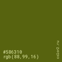 Цвет #586310 в цветовой модели RGB обозначается тремя октетами (88, 99, 16) в десятичном формате и #586310 в шестнадцатиричном (hex) формате, которые являются интенсивностью красного 88 (hex 58), интенсивность зелёного 99 (hex 63) и интенсивность синего 16 (hex 10).
