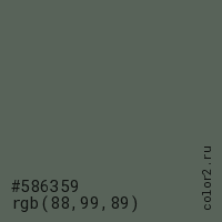 Цвет #586359 в цветовой модели RGB обозначается тремя октетами (88, 99, 89) в десятичном формате и #586359 в шестнадцатиричном (hex) формате, которые являются интенсивностью красного 88 (hex 58), интенсивность зелёного 99 (hex 63) и интенсивность синего 89 (hex 59).