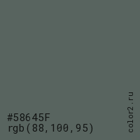 Цвет #58645F в цветовой модели RGB обозначается тремя октетами (88, 100, 95) в десятичном формате и #58645F в шестнадцатиричном (hex) формате, которые являются интенсивностью красного 88 (hex 58), интенсивность зелёного 100 (hex 64) и интенсивность синего 95 (hex 5F).