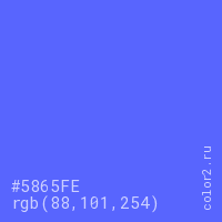 Цвет #5865FE в цветовой модели RGB обозначается тремя октетами (88, 101, 254) в десятичном формате и #5865FE в шестнадцатиричном (hex) формате, которые являются интенсивностью красного 88 (hex 58), интенсивность зелёного 101 (hex 65) и интенсивность синего 254 (hex FE).
