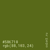 Цвет #586718 в цветовой модели RGB обозначается тремя октетами (88, 103, 24) в десятичном формате и #586718 в шестнадцатиричном (hex) формате, которые являются интенсивностью красного 88 (hex 58), интенсивность зелёного 103 (hex 67) и интенсивность синего 24 (hex 18).