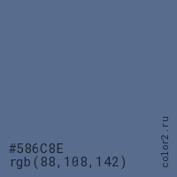 Цвет #586C8E в цветовой модели RGB обозначается тремя октетами (88, 108, 142) в десятичном формате и #586C8E в шестнадцатиричном (hex) формате, которые являются интенсивностью красного 88 (hex 58), интенсивность зелёного 108 (hex 6C) и интенсивность синего 142 (hex 8E).