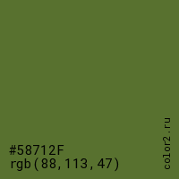 Цвет #58712F в цветовой модели RGB обозначается тремя октетами (88, 113, 47) в десятичном формате и #58712F в шестнадцатиричном (hex) формате, которые являются интенсивностью красного 88 (hex 58), интенсивность зелёного 113 (hex 71) и интенсивность синего 47 (hex 2F).
