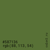 Цвет #587136 в цветовой модели RGB обозначается тремя октетами (88, 113, 54) в десятичном формате и #587136 в шестнадцатиричном (hex) формате, которые являются интенсивностью красного 88 (hex 58), интенсивность зелёного 113 (hex 71) и интенсивность синего 54 (hex 36).