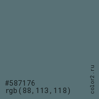 Цвет #587176 в цветовой модели RGB обозначается тремя октетами (88, 113, 118) в десятичном формате и #587176 в шестнадцатиричном (hex) формате, которые являются интенсивностью красного 88 (hex 58), интенсивность зелёного 113 (hex 71) и интенсивность синего 118 (hex 76).