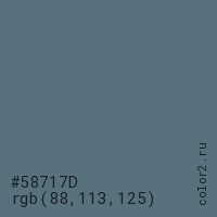 Цвет #58717D в цветовой модели RGB обозначается тремя октетами (88, 113, 125) в десятичном формате и #58717D в шестнадцатиричном (hex) формате, которые являются интенсивностью красного 88 (hex 58), интенсивность зелёного 113 (hex 71) и интенсивность синего 125 (hex 7D).