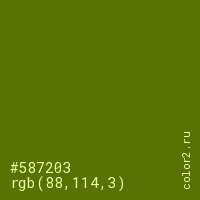Цвет #587203 в цветовой модели RGB обозначается тремя октетами (88, 114, 3) в десятичном формате и #587203 в шестнадцатиричном (hex) формате, которые являются интенсивностью красного 88 (hex 58), интенсивность зелёного 114 (hex 72) и интенсивность синего 3 (hex 03).