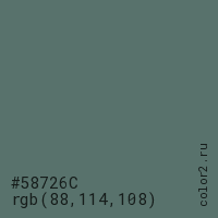 Цвет #58726C в цветовой модели RGB обозначается тремя октетами (88, 114, 108) в десятичном формате и #58726C в шестнадцатиричном (hex) формате, которые являются интенсивностью красного 88 (hex 58), интенсивность зелёного 114 (hex 72) и интенсивность синего 108 (hex 6C).