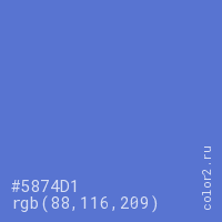 Цвет #5874D1 в цветовой модели RGB обозначается тремя октетами (88, 116, 209) в десятичном формате и #5874D1 в шестнадцатиричном (hex) формате, которые являются интенсивностью красного 88 (hex 58), интенсивность зелёного 116 (hex 74) и интенсивность синего 209 (hex D1).