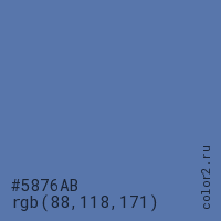 Цвет #5876AB в цветовой модели RGB обозначается тремя октетами (88, 118, 171) в десятичном формате и #5876AB в шестнадцатиричном (hex) формате, которые являются интенсивностью красного 88 (hex 58), интенсивность зелёного 118 (hex 76) и интенсивность синего 171 (hex AB).