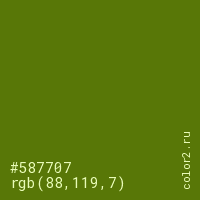 Цвет #587707 в цветовой модели RGB обозначается тремя октетами (88, 119, 7) в десятичном формате и #587707 в шестнадцатиричном (hex) формате, которые являются интенсивностью красного 88 (hex 58), интенсивность зелёного 119 (hex 77) и интенсивность синего 7 (hex 07).
