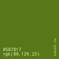 Цвет #587817 в цветовой модели RGB обозначается тремя октетами (88, 120, 23) в десятичном формате и #587817 в шестнадцатиричном (hex) формате, которые являются интенсивностью красного 88 (hex 58), интенсивность зелёного 120 (hex 78) и интенсивность синего 23 (hex 17).