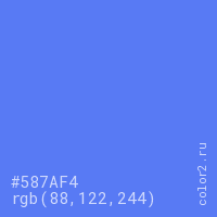 Цвет #587AF4 в цветовой модели RGB обозначается тремя октетами (88, 122, 244) в десятичном формате и #587AF4 в шестнадцатиричном (hex) формате, которые являются интенсивностью красного 88 (hex 58), интенсивность зелёного 122 (hex 7A) и интенсивность синего 244 (hex F4).