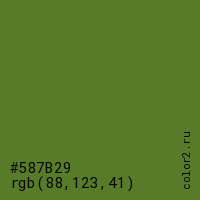 Цвет #587B29 в цветовой модели RGB обозначается тремя октетами (88, 123, 41) в десятичном формате и #587B29 в шестнадцатиричном (hex) формате, которые являются интенсивностью красного 88 (hex 58), интенсивность зелёного 123 (hex 7B) и интенсивность синего 41 (hex 29).