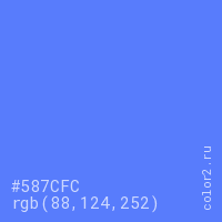Цвет #587CFC в цветовой модели RGB обозначается тремя октетами (88, 124, 252) в десятичном формате и #587CFC в шестнадцатиричном (hex) формате, которые являются интенсивностью красного 88 (hex 58), интенсивность зелёного 124 (hex 7C) и интенсивность синего 252 (hex FC).