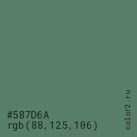 Цвет #587D6A в цветовой модели RGB обозначается тремя октетами (88, 125, 106) в десятичном формате и #587D6A в шестнадцатиричном (hex) формате, которые являются интенсивностью красного 88 (hex 58), интенсивность зелёного 125 (hex 7D) и интенсивность синего 106 (hex 6A).