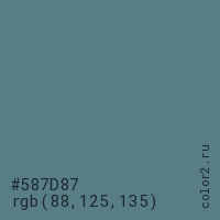 Цвет #587D87 в цветовой модели RGB обозначается тремя октетами (88, 125, 135) в десятичном формате и #587D87 в шестнадцатиричном (hex) формате, которые являются интенсивностью красного 88 (hex 58), интенсивность зелёного 125 (hex 7D) и интенсивность синего 135 (hex 87).