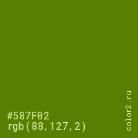 Цвет #587F02 в цветовой модели RGB обозначается тремя октетами (88, 127, 2) в десятичном формате и #587F02 в шестнадцатиричном (hex) формате, которые являются интенсивностью красного 88 (hex 58), интенсивность зелёного 127 (hex 7F) и интенсивность синего 2 (hex 02).