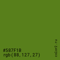 Цвет #587F1B в цветовой модели RGB обозначается тремя октетами (88, 127, 27) в десятичном формате и #587F1B в шестнадцатиричном (hex) формате, которые являются интенсивностью красного 88 (hex 58), интенсивность зелёного 127 (hex 7F) и интенсивность синего 27 (hex 1B).