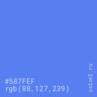 Цвет #587FEF в цветовой модели RGB обозначается тремя октетами (88, 127, 239) в десятичном формате и #587FEF в шестнадцатиричном (hex) формате, которые являются интенсивностью красного 88 (hex 58), интенсивность зелёного 127 (hex 7F) и интенсивность синего 239 (hex EF).