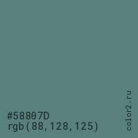 Цвет #58807D в цветовой модели RGB обозначается тремя октетами (88, 128, 125) в десятичном формате и #58807D в шестнадцатиричном (hex) формате, которые являются интенсивностью красного 88 (hex 58), интенсивность зелёного 128 (hex 80) и интенсивность синего 125 (hex 7D).