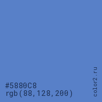 Цвет #5880C8 в цветовой модели RGB обозначается тремя октетами (88, 128, 200) в десятичном формате и #5880C8 в шестнадцатиричном (hex) формате, которые являются интенсивностью красного 88 (hex 58), интенсивность зелёного 128 (hex 80) и интенсивность синего 200 (hex C8).