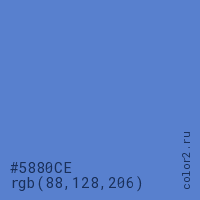 Цвет #5880CE в цветовой модели RGB обозначается тремя октетами (88, 128, 206) в десятичном формате и #5880CE в шестнадцатиричном (hex) формате, которые являются интенсивностью красного 88 (hex 58), интенсивность зелёного 128 (hex 80) и интенсивность синего 206 (hex CE).