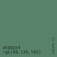 Цвет #588269 в цветовой модели RGB обозначается тремя октетами (88, 130, 105) в десятичном формате и #588269 в шестнадцатиричном (hex) формате, которые являются интенсивностью красного 88 (hex 58), интенсивность зелёного 130 (hex 82) и интенсивность синего 105 (hex 69).