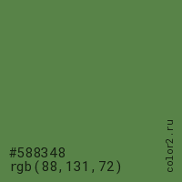 Цвет #588348 в цветовой модели RGB обозначается тремя октетами (88, 131, 72) в десятичном формате и #588348 в шестнадцатиричном (hex) формате, которые являются интенсивностью красного 88 (hex 58), интенсивность зелёного 131 (hex 83) и интенсивность синего 72 (hex 48).