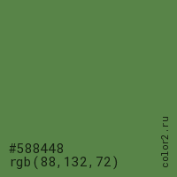 Цвет #588448 в цветовой модели RGB обозначается тремя октетами (88, 132, 72) в десятичном формате и #588448 в шестнадцатиричном (hex) формате, которые являются интенсивностью красного 88 (hex 58), интенсивность зелёного 132 (hex 84) и интенсивность синего 72 (hex 48).
